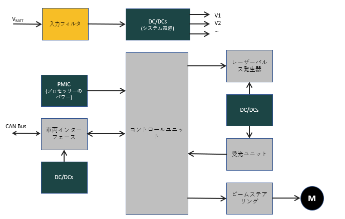 LiDAR システムは、コントロール ユニット、レーザー パルス ジェネレーター (Tx)、光感知ユニット (Rx)、ビーム ステアリング、車両インターフェイス、およびシステム全体に電力を供給するいくつかの DC/DC で構成されます。