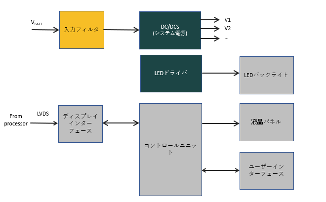センター情報ディスプレイ システムは、コントロール ユニット、ディスプレイ インターフェイス、LCD パネル、LED バックライト、LED ドライバー、およびシステム全体に電力を供給するいくつかの DC/DC で構成されます。