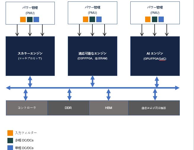 AI エンジンは、タスクを実行するための正確な電圧と十分な電力を提供するさまざまな電源レールで構成されています。 効率を向上させるために、単相または多相 DC/DC の最新技術が使用されます。